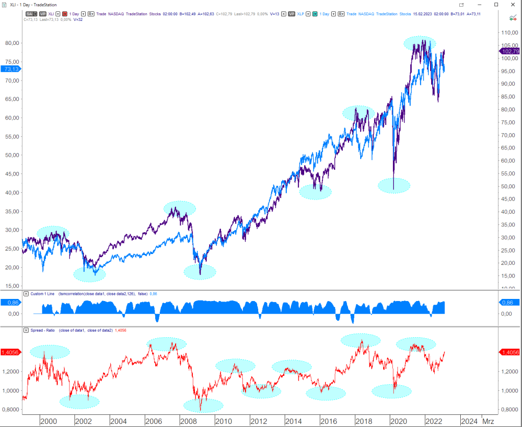 Furthermore, the XLI/XLP ratio can be used to assess stock market valuation.